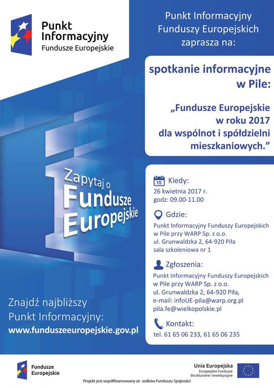 26 kwietnia 2017 r. w godz. 09:00-11:00 odbędzie się bezpłatne spotkanie informacyjne organizowane przez Punkt Informacyjny Funduszy Europejskich w Pile pt. „Fundusze Europejskie dla wspólnot i spółdzielni mieszkaniowych”.