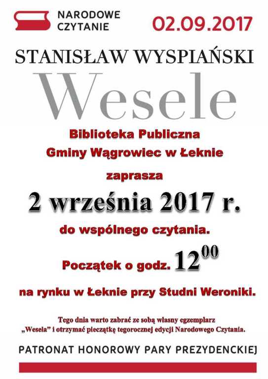 Narodowe Czytanie 2017 Opublikowano: 02 września 2017 12:44 Kategoria: Aktualności Wyświetleń: 630 Wydrukuj Zobacz równieżBiałe i czerwone róże z Brietlingen17 kolejka Ligi Gminnej LZS Zapraszamy na Dożynki Powiatowo-Gminne w...Narodowe Czytanie 2017 Mobilny Punkt Informacyjny Funduszy Europejskich... Mobilny Punkt Informacyjny Funduszy Europejskich...