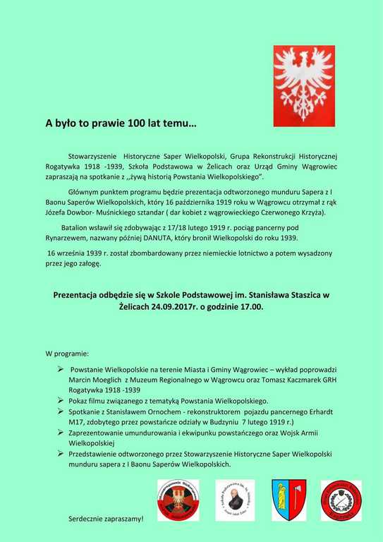 Spotkanie z „żywą historią Powstania Wielkopolskiego” Opublikowano: 22 września 2017 14:09 Kategoria: Aktualności Wyświetleń: 663 Wydrukuj Zobacz również Łomot po poznańsku czyli spotkanie z „żywą...Manewry ratownictwa medycznego Łekno 2017 Rozporządzenie w sprawie zwalczania zgnilca... Spotkanie z „żywą historią Powstania...Zakończenie Gminnej Ligi LZS „Orlik 2017”Projekt „Przyszłość zaczyna się dziś”