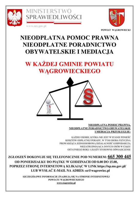 Nieodpłatna pomoc prawna i mediacja jest zadaniem zleconym z zakresu administracji rządowej, realizowanym przez Powiat Wągrowiecki w porozumieniu z Gminami: Damasławek, Gołańcz, Mieścisko, Skoki, Wapno, Miasto i Gmina Wągrowiec.