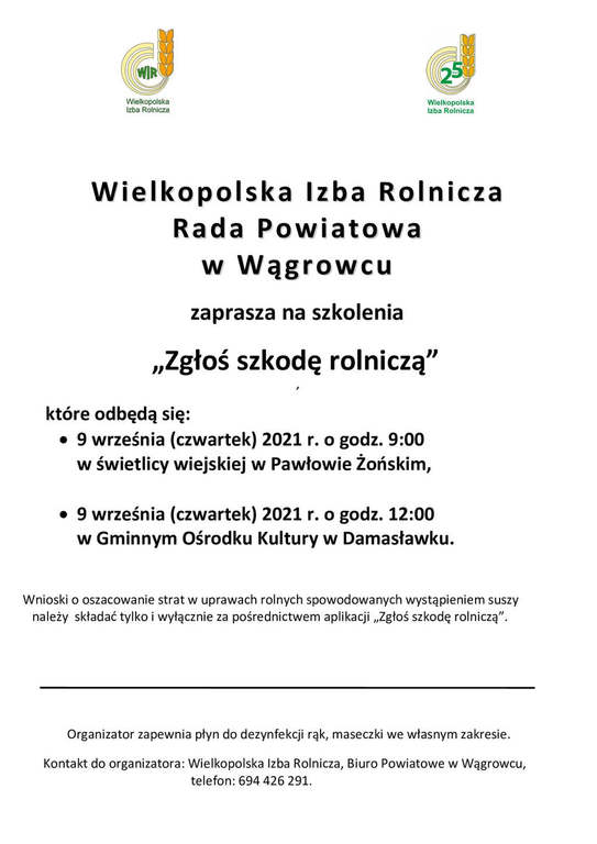 Szkolenia dla rolników Opublikowano: 31 sierpnia 2021 16:26 Kategoria: Aktualności Wyświetleń: 458 Wydrukuj Zobacz również Zapraszamy do udziału w projekcie „Ziemia... Wyjątkowa uroczystość w Gminie Wągrowiec -...82. rocznica wybuchu II wojny światowejSzkolenia dla rolnikówEKOLOGICZNY FESTYN RODZINNYObrączkowanie bocianów na terenie Gminy Wągrowiec