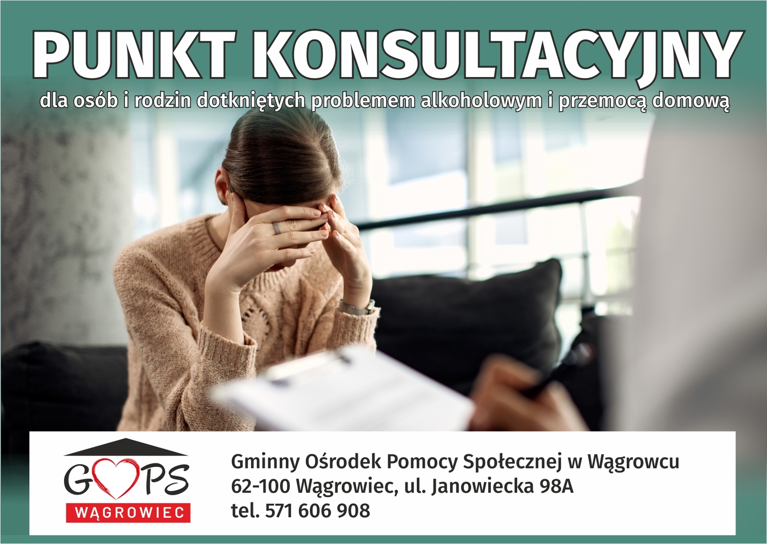W siedzibie Gminnego Ośrodka Pomocy Społecznej w Wągrowcu, ul. Janowiecka 98 A, 62-100 Wągrowiec działa Punkt Konsultacyjny dla osób i rodzin dotkniętych problemem alkoholowym i przemocą domową.