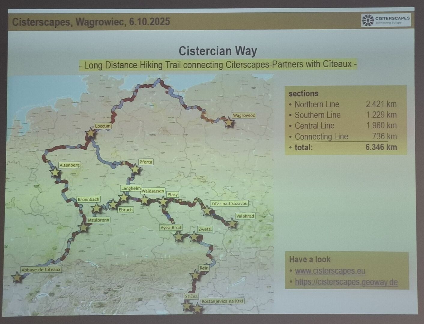 Do końca 2026 roku planowane jest przedłużenie szlaku o nowy odcinek łączący Polskę i Czechy. Prace przygotowawcze nabierają tempa – 6 października 2025 r. w Urzędzie Gminy Wągrowiec odbyło się drugie spotkanie koordynacyjne z udziałem: Alexandry Baier – koordynatorki projektu Cisterscapes reprezentującej powiat Bamberg, Hansa-Georga Sieversa – przedstawiciela projektu Cisterscapes, Alesa Mergental – burmistrza miasta Velehrad (on-line), Małgorzaty Chmielarz – Wójt Gminy Wągrowiec, Kamili Kłos – koordynatorki z Gminy Wągrowiec, Małgorzaty Kranc-Rybczyńskiej – dyrektor Muzeum Regionalnego i koordynatorki z Miasta Wągrowiec, Marcina Moeglicha – historyka z Muzeum Regionalnego oraz dr. Lesława Pilca – członka PTTK.
