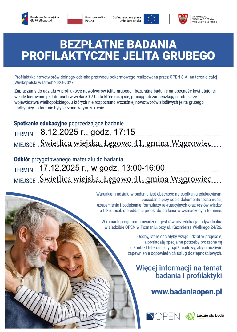 Bezpłatne badanie profilaktyczne jelita grubego [8.12.2025] Opublikowano: 04 listopada 2025 18:09 Kategoria: Aktualności Wyświetleń: 41 Wydrukuj Zobacz równieżPlanowane wyłączenia prądu [4 - 13 listopada] 10 listopada 2025 Urzęd Gminy Wągrowiec będzie... Ogłoszenie o przystąpieniu do konsultacji... Bezpłatne badanie profilaktyczne jelita grubego...Pomoc Pogorzelcom z KobylcaMeldunek DG-1 informacja