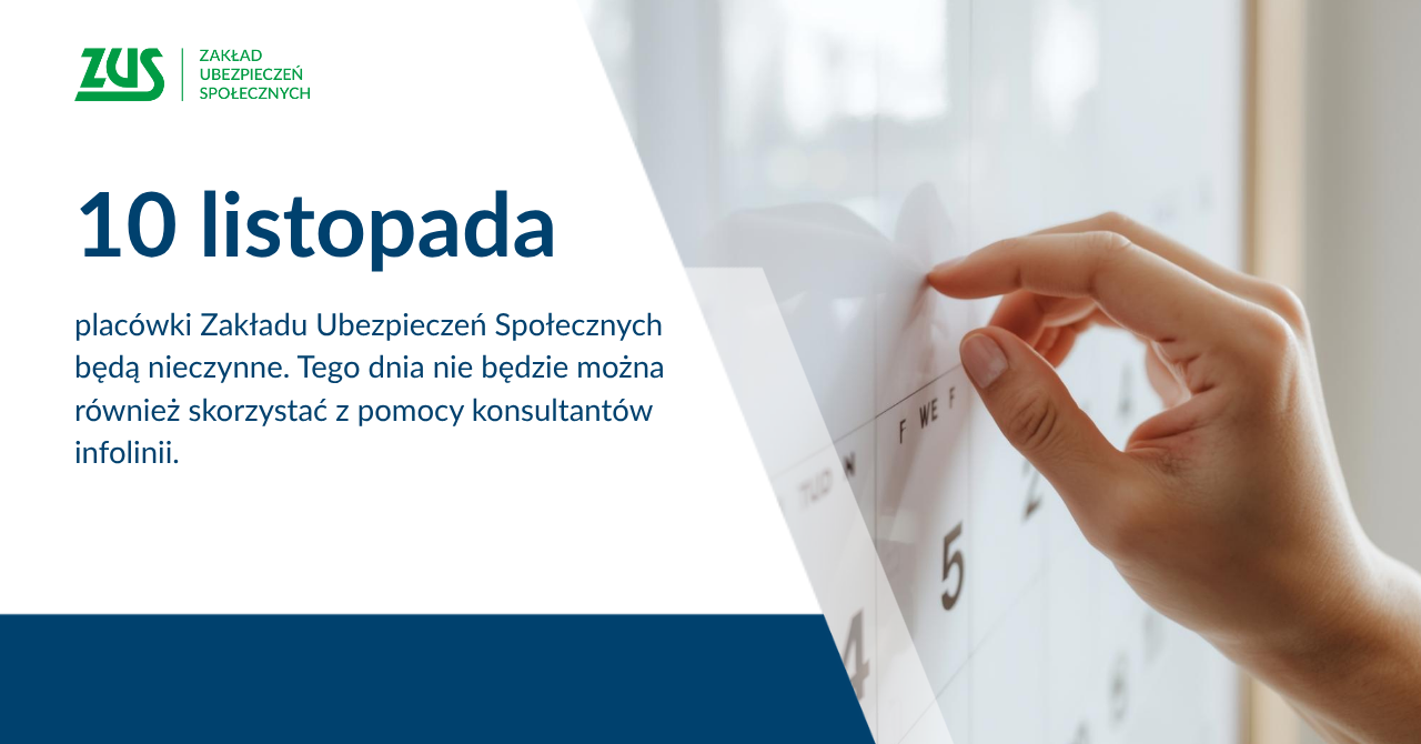 W poniedziałek 10 listopada 2025 r. wszystkie placówki ZUS będą zamknięte. Tego dnia nie będzie można również skorzystać z pomocy konsultantów infolinii ZUS. 10 listopada jest dniem wolnym dla pracowników ZUS za dzień świąteczny – sobotę 1 listopada 2025 r.