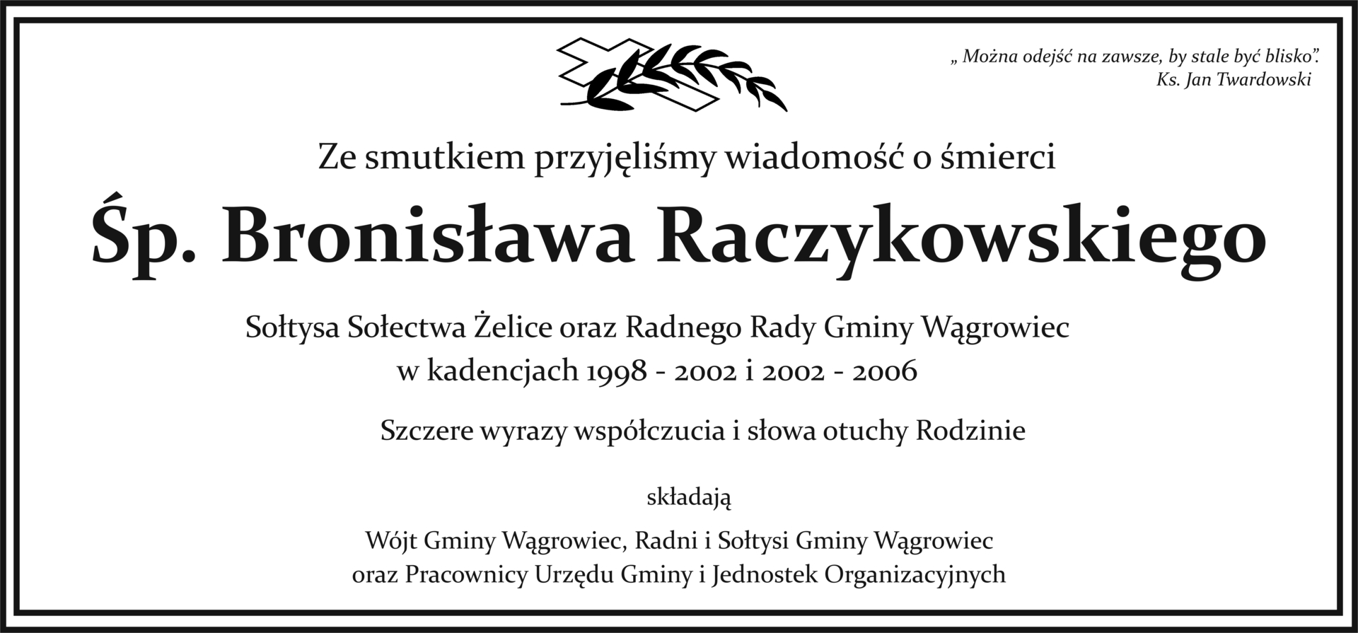 Z ŻAŁOBNEJ KARTY Opublikowano: 25 listopada 2025 12:09 Kategoria: Aktualności Wyświetleń: 57 Wydrukuj Zobacz również Zimą bądźmy szczególnie wrażliwi na osoby... IMGW - Ostrzeżenie meteorologiczne - Intensywne... Wizyta starosty powiatu Bamberg w Wągrowcu w...Z ŻAŁOBNEJ KARTYBEZPŁATNE BADANIA MAMMOGRAFICZNE - 15.12.2025 Zaproszenie do udziału w stacjonarnym szkoleniu o...