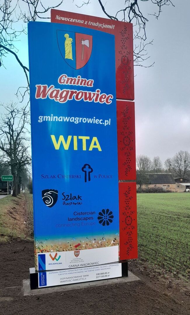 Zakończono realizację zadania pn.: „Poprawa i rozwój infrastruktury okołoszlakowej służącej uprawianiu turystyki kwalifikowanej na terenie Gminy Wągrowiec”, w ramach którego wykonano 9 tablic informacyjnych – witaczy zlokalizowanych wzdłuż dróg powiatowych i wojewódzkich położonych na terenie Gminy Wągrowiec.