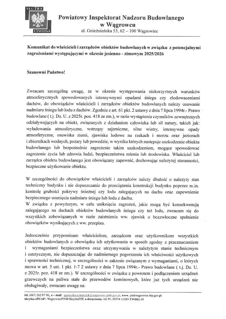 Komunikat Powiatowego Inspektora Nadzoru Budowlanego w związku z potencjalnymi zagrożeniami występującymi w okresie jesienno – zimowym 2025-2026 Opublikowano: 19 stycznia 2026 11:15 Kategoria: Aktualności Wyświetleń: 46 Wydrukuj Zdjęcia: Zobacz również WAŻNA INFORMACJA! Od 1 stycznia 2026 roku koniec... Diagnoza służąca wyznaczeniu obszaru... DYŻUR PRAWNIKA W PUNKCIE KONSULTACYJNYM - 20... Komunikat Powiatowego Inspektora Nadzoru...BEZPŁATNE BADANIA MAMMOGRAFICZNE - 19.01.2026 OBWIESZCZENIE WOJEWODY WIELKOPOLSKIEGO z dnia 16...