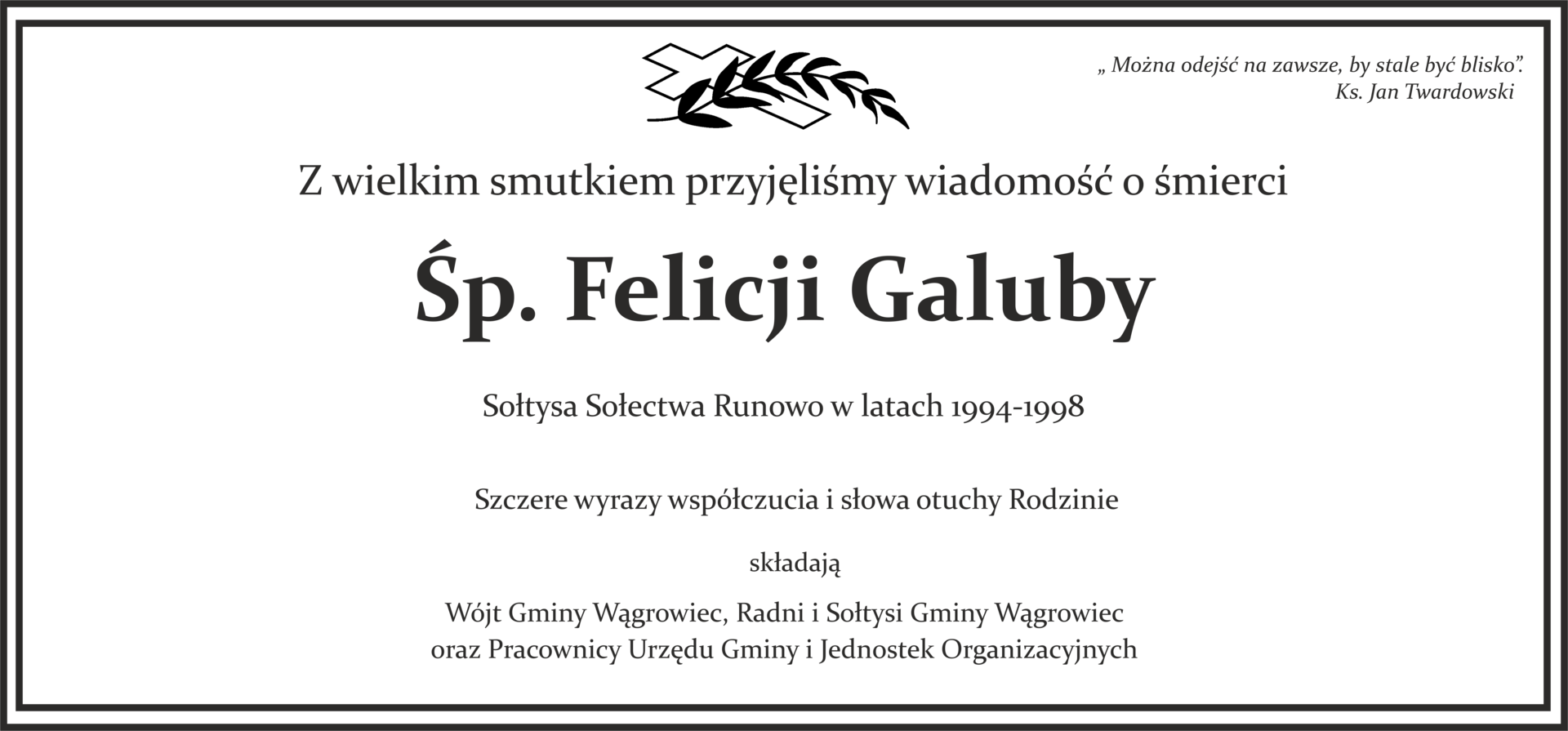 Z ŻAŁOBNEJ KARTY Uroczystości pogrzebowe odbędą się w piątek 23 stycznia 2026 r. i rozpoczną się mszą świętą o godz. 10.00 w kościele pw. św. Jakuba Ap. w Wągrowcu (Fara). Pogrzeb odbędzie się na cmentarzu starofarnym w Wągrowcu o godz. 11.00 Opublikowano: 21 stycznia 2026 10:19 Kategoria: Aktualności Wyświetleń: 57 Wydrukuj Zobacz również Zielono-niebieska infrastruktura w Gminie... Zwiększ swoje kompetencje w ramach projektu... Informacja o programie profilaktyki i wczesnego...Z ŻAŁOBNEJ KARTYDzień Babci i Dziadka Muzyczne świętowanie tradycji – Konkurs Kolęd i...