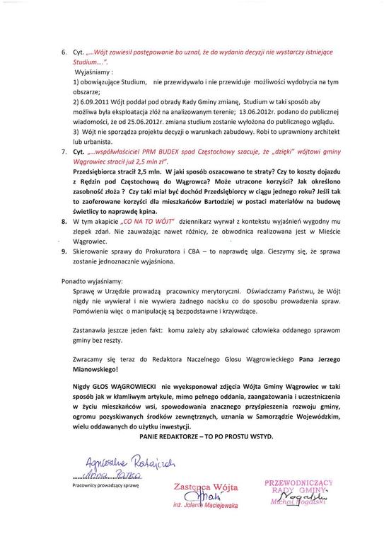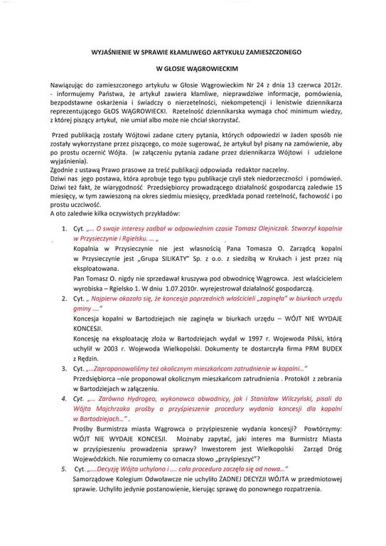 Nawiązując do zamieszczonego artykułu w Głosie Wągrowieckim Nr 24 z dnia 13 czerwca 2012r.- informujemy Państwa, że artykuł zawiera kłamliwe, nieprawdziwe informacje, pomówienia, bezpodstawne oskarżenia i świadczy o nierzetelności, niekompetencji i lenistwie dziennikarza reprezentującego GŁOS WĄGROWIECKI. Rzetelność dziennikarska wymaga choć minimum wiedzy, z której piszący artykuł, nie umiał albo może nie chciał skorzystać.