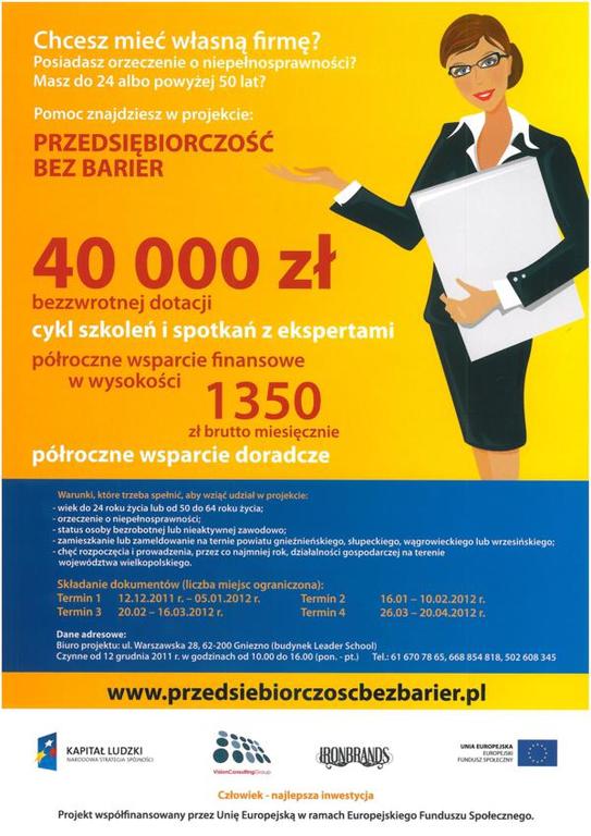Przedsiębiorczość bez barier Chcesz mieć własną firmę? Posiadasz orzeczenie o niepełnosprawności? Masz od 24 albo powyżej 50lat? Pomoc znajdziesz w projekcie: PRZEDSIĘBIORCZOŚĆ BEZ BARIER. 40 000 zł bezzwrotnej dotacji. http://przedsiebiorczoscbezbarier.pl/ Opublikowano: 08 grudnia 2011 08:45 Kategoria: Aktualności Wyświetleń: 277 Wydrukuj Zobacz równieżKolejny sukces PCK Sprostowanie, dotyczące pozyskiwania pieniędzy z... Zimowe utrzymanie dróg gminnych w sezonie...Przedsiębiorczość bez barierUlgi dla krwiodawców PODSUMOWANIE IX EDYCJI GMINNEGIO KONKURSU...