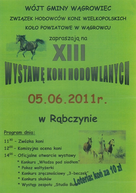 Wystawa Koni Hodowlanych Wójt Gminy Wągrowiec, Związek Hodowców Koni Wielkopolskich oraz Koło Powiatowe w Wągrowcu zapraszają na XIII Wystawę Koni Hodowlanych 5 czerwca 2011 r. Opublikowano: 01 czerwca 2011 10:02 Kategoria: Aktualności Wyświetleń: 363 Wydrukuj Zobacz równieżZBIÓRKA ZUŻYTEGO SPRZĘTUPięć kroków do bezpiecznej żywnościKoncert - YesternightWystawa Koni HodowlanychOrder Serca - Matkom Wsi. Harmonogram spotkań informacyjno-promocyjnych –...