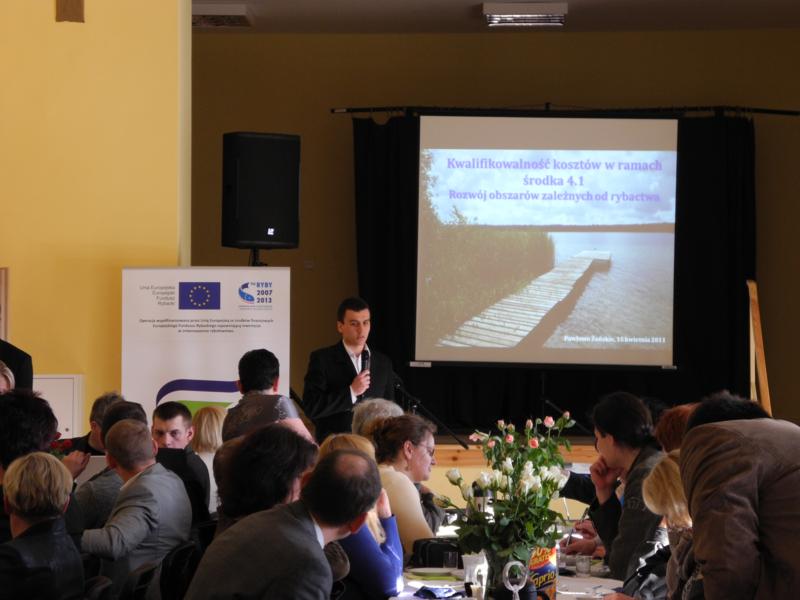 Wśród zaproszonych gości nie zabrakło przedstawicieli Urzędu Marszałkowskiego. Pani Karolina Szambelańczyk – kierownik Oddziału Obsługi PO RYBY zapoznała zebranych z zasadami aplikowania o środki w ramach PO RYBY, wzorem wniosku o dofinansowanie operacji wraz z niezbędnymi załącznikami a Pan Krystian Margan omówił zasady kwalifikowania wydatków w ramach tego programu.