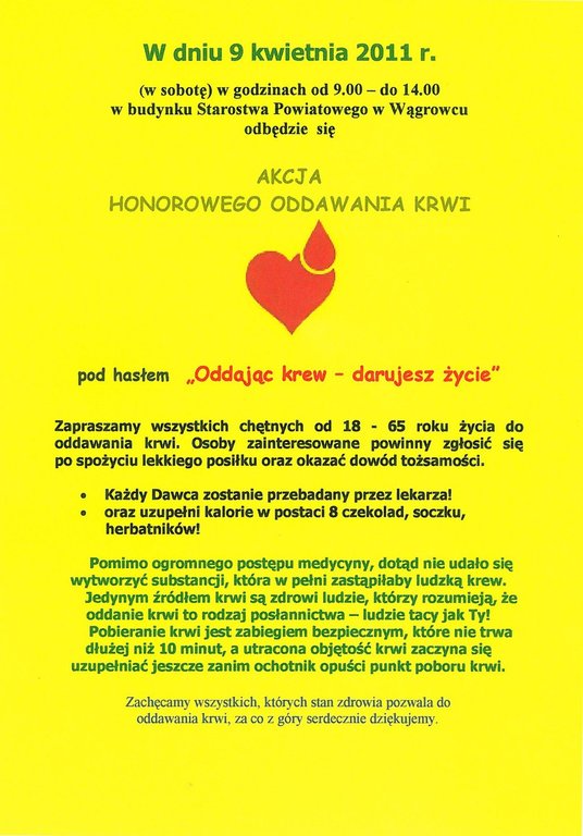 Oddając krew - darujesz życie W dniu 9 kwietnia 2011 r. (w sobotę) w godzinach od 9.00 - 14.00 w budynku Starostwa Powiatowego w Wągrowcu odbędzie się Akcja Honorowego Oddawania Krwi. Opublikowano: 05 kwietnia 2011 10:17 Kategoria: Aktualności Wyświetleń: 255 Wydrukuj Zobacz równieżSpotkanie w gronie „7 Ryb” Szkoła Podstawowa im. Stanisława Staszica została...Narodowy Spis PowszechnyOddając krew - darujesz życieWielkie serce rolnikówSpotkanie z Ministrem Rolnictwa