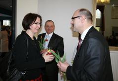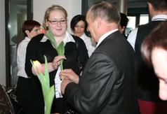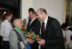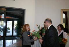 Witając, Pan Wójt z Panem Przewodniczącym wręczali Paniom tulipany.