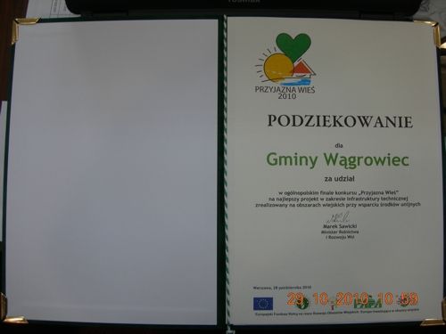 Na zaproszenie Ministra Rolnictwa Pana Marka Sawickiego Gminę Wągrowiec na konferencji reprezentowali, Pani Jolanta Maciejewska – Kierownik Referatu Inwestycji i Gospodarki Przestrzennej Urzędu Gminy Wągrowiec oraz Pan Przemysław Majchrzak – Wójt Gminy Wągrowiec, któremu wyróżnienie Ministra Rolnictwa i Rozwoju Wsi za udział w konkursie wręczył Artur Ławniczak – Podsekretarz Stanu w MRiRW oraz Ryszard Pazura - Dyrektor Fundacji Programów Pomocy dla Rolnictwa FAPA.