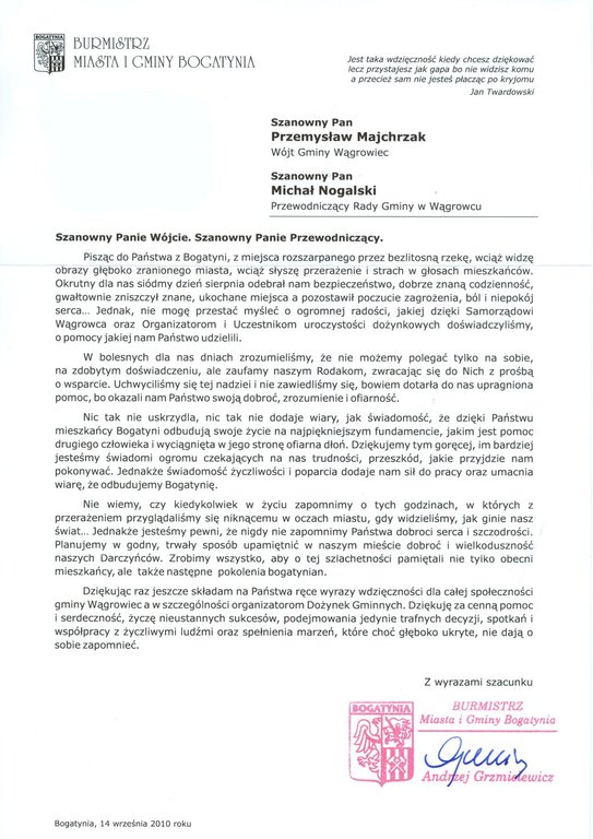 Pisząc do Państwa z Bogatyni, z miejsca rozszarpanego przez bezlitosną rzekę, wciąż widzę obrazy głęboko zranionego miasta, wciąż słyszę przerażenie i strach w głosach mieszkańców. Okrutny dla nas siódmy dzień sierpnia odebrał nam bezpieczeństwo, dobrze znaną codzienność, gwałtownie zniszczył znane, ukochane miejsca a pozostawił poczucie zagrożenia, ból i niepokój serca...