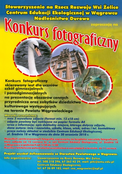 Konkurs fotograficzny Stowarzyszenie na Rzecz Rozwoju Wsi Żelice, Centrum Edukacji Ekologicznej w Wągrowcu oraz Nadleśnictwo Durowo zapraszają na „Konkurs fotograficzny”. Opublikowano: 09 czerwca 2010 11:46 Kategoria: Aktualności Wyświetleń: 223 Wydrukuj Zobacz równieżStrzeżone kąpieliskaApel o pomoc dla powodzianWybory na Prezydenta RP – Gmina WągrowiecKonkurs fotograficznySpotkanie z okazji Dnia Matki.Mamy Laureata!