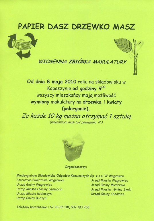 Papier dasz drzewko masz Od 8 maja 2010 roku na składowisku w Kopaszynie od godziny 900 rozpocznie się wiosenna zbiórka makulatury , wszyscy mieszkańcy mają możliwość wymiany makulatury na drzewka i kwiaty. Opublikowano: 28 kwietnia 2010 11:53 Kategoria: Aktualności Wyświetleń: 323 Wydrukuj Zobacz również Spotkanie przedstawiające koncepcje studium i...Absolutorium dla WójtaRozstrzygnięto konkurs „Moja Zimowa Stołówka”Papier dasz drzewko maszOgłoszenie przetarguFinał konkursu