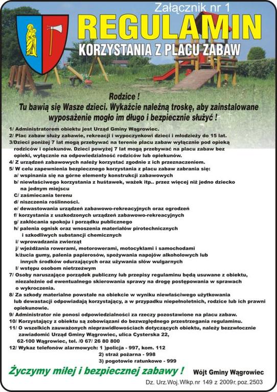 Użytkownicy mają teraz możliwość zapoznania się z zasadami korzystania z tych obiektów w tym również z obowiązującymi na nich zakazami. Jest to kolejny krok Gminy Wągrowiec w kierunku zwiększania bezpieczeństwa na tego typu obiektach. Od kilku już lat kupowane są wyłącznie urządzenia zabawowe posiadające atesty bezpieczeństwa, część obiektów zwłaszcza tych znajdujących się w pobliżu ruchliwych dróg została również w pierwszej kolejności ogrodzona.