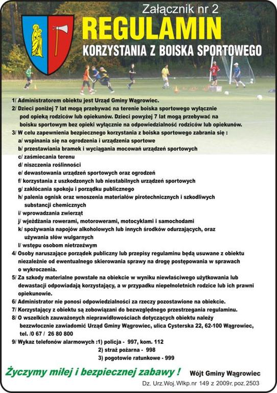 W celu zwiększenia bezpieczeństwa na wszystkich obiektach sportowo - rekreacyjnych gminy Wągrowiec zamontowano regulaminy korzystania z boisk sportowych i placów zabaw.