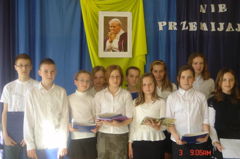 Podczas koncertu zatytułowanego „Święci nie przemijają” usłyszeliśmy piosenki ku czci Jana Pawła II zaśpiewane przez uczniów naszej szkoły. Na koniec koncertu wszyscy trzymając się za ręce wykonaliśmy ulubioną pieśń Ojca Świętego „Barkę”.