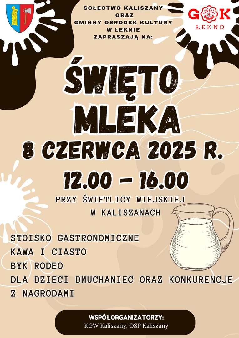 Zapraszamy Was na wyjątkowe wydarzenie! 8 czerwca 2025 r., w godz. 12:00 - 16:00 przy świetlicy wiejskiej w Kaliszanach odbędzie się Święto Mleka!