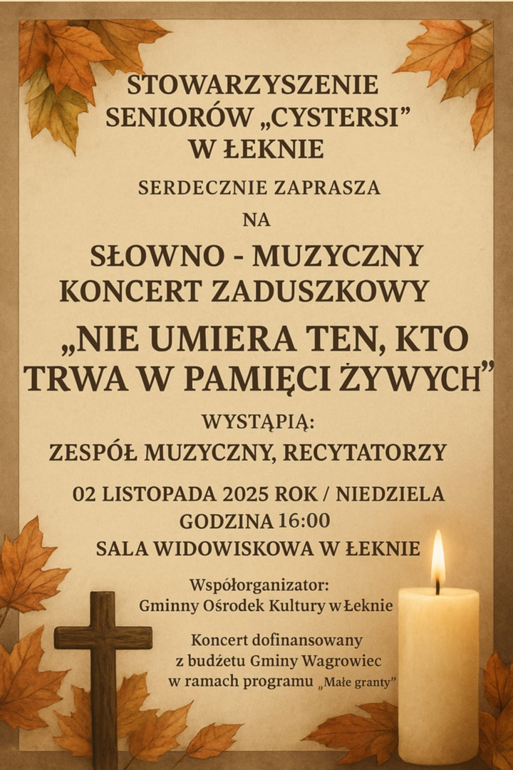 Koncerty: impreza darmowa Słowno-Muzyczny Koncert Zaduszkowy Kiedy?02 listopada 2025 od: 16:00 do 18:00 Gdzie?ul. Polna, Łekno, Wągrowiec, wągrowiecki, wielkopolskie Sala Widowiskowa w Łeknie Zobacz również07.09.2025Dożynki Gminne11.10.2025 I Jesienny Rajd Rowerowy z Radą Seniorów Gminy...12.10.2025Montaż słowno-muzyczny „Janie Pawle Bracie Nasz”02.11.2025Słowno-Muzyczny Koncert Zaduszkowy11.11.2025Gminne Obchody Święta Niepodległości07.12.2025Jarmark Mikołajkowy