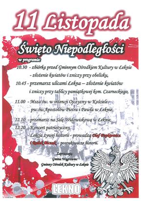 Uroczystości: impreza otwarta Gminne Obchody Narodowego Święta Niepodległości Kiedy?11 listopada 2016 10:30 Gdzie?Łekno, Wągrowiec, wągrowiecki, wielkopolskie Łekno Zobacz również02.11.2016Zaduszki11.11.2016Gminne Obchody Narodowego Święta Niepodległości11.11.2016Koncert Muzyki Polskiej26.11.2016Peregrynacja dokumentu Zbyluta do źródeł