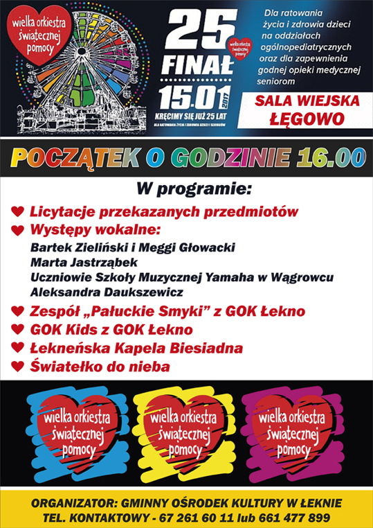 Inne: impreza otwarta 25 Finał WOŚP w Łęgowie Kiedy?15 stycznia 2017 od: 07:00 do 21:00 Gdzie?Łęgowo, Wągrowiec, wągrowiecki, wielkopolskie Sala Wiejska Łęgowo Zobacz również11.11.2016Gminne Obchody Narodowego Święta Niepodległości11.11.2016Koncert Muzyki Polskiej26.11.2016Peregrynacja dokumentu Zbyluta do źródeł15.01.201725 Finał WOŚP w Łęgowie05.05.2017II Weekend na Szlaku Piastowskim13.05.2017 150-lecie Szkoły Podstawowej w Zespole Szkół w...