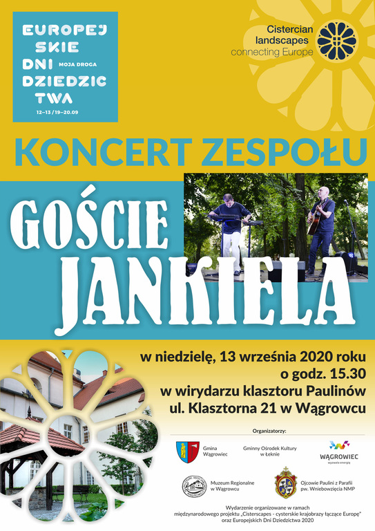 Koncerty: impreza darmowa, impreza otwarta Koncert Zespołu „Goście Jankiela” Kiedy?13 września 2020 od: 15:00 do 16:00 Gdzie?Wągrowiec, wągrowiecki, wielkopolskie Wągrowiec Zobacz również30.06.2019Miejsko-Gminne Zawody Sportowo-Pożarnicze07.07.2019XXV Jarmark Cysterski08.09.2020Jubileusze Małżeńskie13.09.2020Koncert Zespołu „Goście Jankiela”04.10.2020 Muzyczno-kabaretowy program z okazji...24.10.2020„Zapal Znicz Pamięci”