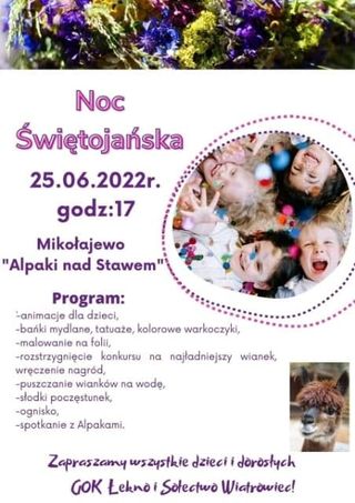 Koncerty: impreza plenerowa Noc Świętojańska Kiedy?25 czerwca 2022 od: 17:00 do 19:00 Gdzie?Wągrowiec, wągrowiecki, wielkopolskie Mikołajewo „Alpaki nad stawem” Zobacz również20.06.2022 Prelekcja pt. Ocena jakości wód Jeziora...23.06.2022Weekend na Szlaku Piastowskim24.06.2022Koncert Youth Novels25.06.2022Noc Świętojańska25.06.2022Noc Świętojańska26.06.2022Miejsko-Gminne Zawody Sportowo-Pożarnicze