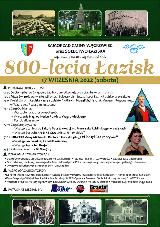 Koncerty: impreza plenerowa 800-lecie Łazisk Kiedy?17 września 2022 od: 12:45 do 23:00 Gdzie?Łaziska, Wągrowiec, wągrowiecki, wielkopolskie boisko przy Szkole Podstawowej Zobacz również27.08.20224 Moto Piknik04.09.2022Dożynki Powiatowo-Gminne11.09.2022Święto Mleka oraz Turniej Wsi na Wesoło17.09.2022800-lecie Łazisk04.12.2022Gminne Mikołajki 202211.03.2023Koncert z okazji Dnia Kobiet