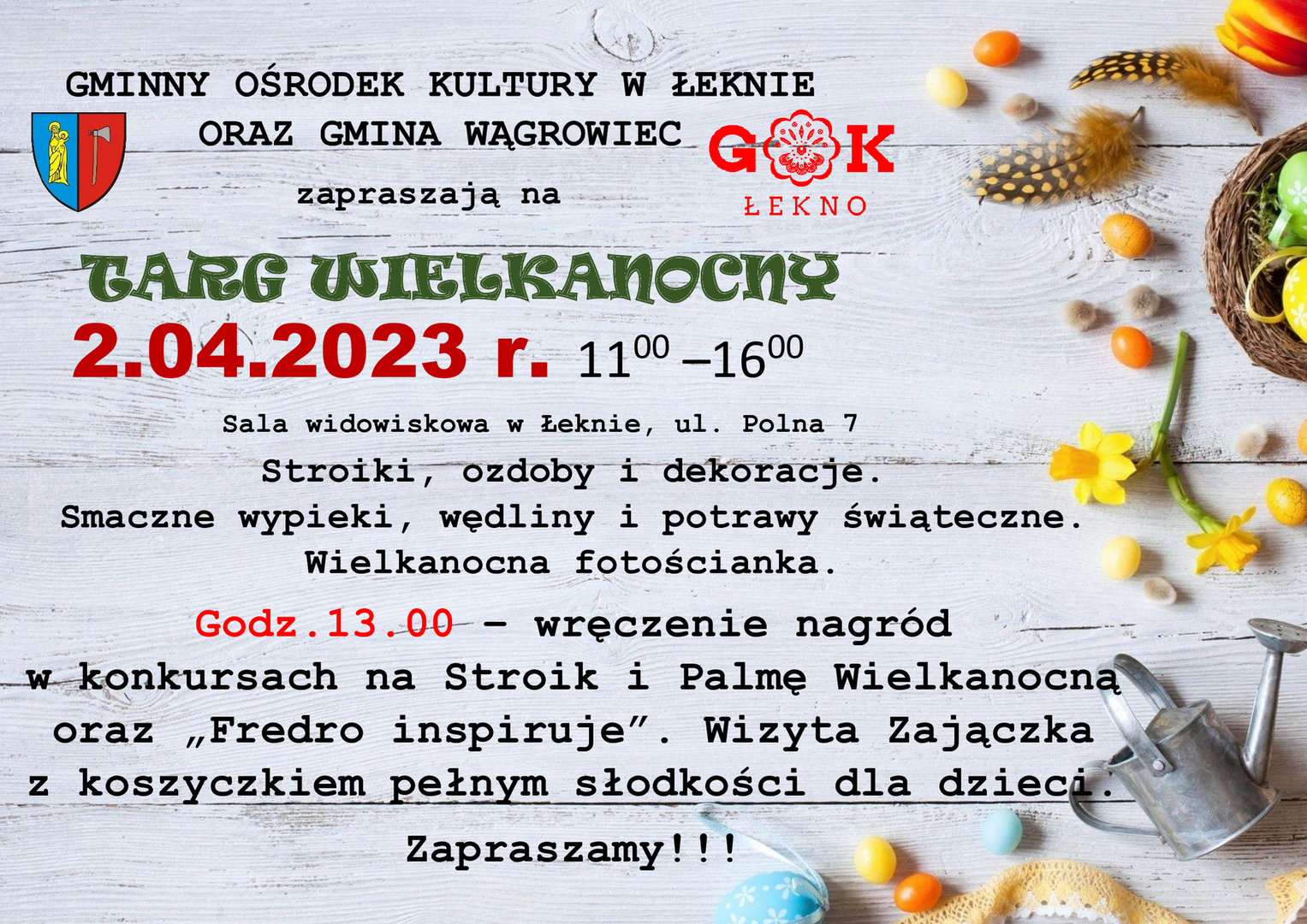 Inne: impreza darmowa Targ Wielkanocny Kiedy?02 kwietnia 2023 od: 11:00 do 16:00 Gdzie?ul. Polna 7, Łekno, Wągrowiec, wągrowiecki, wielkopolskie Teren sali widowiskowej w Łeknie Zobacz również17.09.2022800-lecie Łazisk04.12.2022Gminne Mikołajki 202211.03.2023Koncert z okazji Dnia Kobiet02.04.2023Targ Wielkanocny24.06.2023Noc Świętojańska30.06.2023XII Forum Szlaku Cysterskiego w Polsce